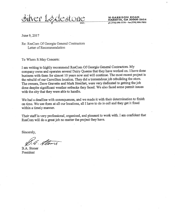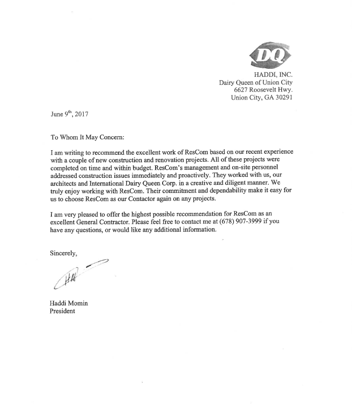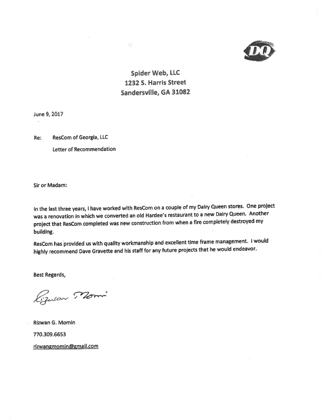 "I am writing to highly recommend ResCom of Georgia General Contractors. My company owns and operates several Dairy Queens that they have worked on. I have done business with them for almost 10 years now and will continue. The most recent project is the rebuild of our Carollton location. They did tremendous job rebuilding the store. The owners, Dave Gravette and Mark Streifert were very dedicated to getting the job done despite significant weather setbacks they faced. We also faced some permit issues with the city that they were able to handle. We had a deadline with consequences and we made it with their determination to finish on time. We use them at all our locations, all I have to do is call and they get it fixed within a timely manner. The staff is very professional, organized and pleasant to work with. I am confident that ResCom will do a great job no matter the project they have."